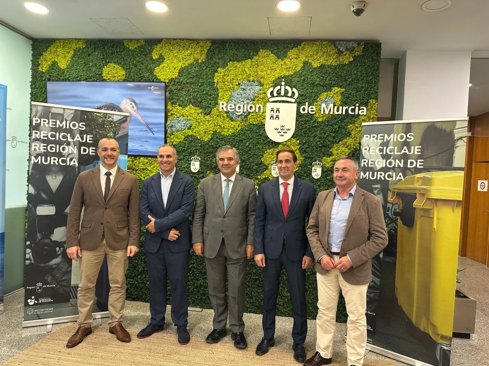 Acompañado del presidente de la Federación de Municipios de la Región de Murcia, Víctor Manuel Abenza, el gerente de Ecoembes en la Región, Juan Carlos Arranz, y el alcalde de Moratalla, y primer ganador de la novena edición, de los ‘Premios Reciclaje Región de Murcia 2024’. En la X edición de estos premios, se reconocerán a los tres municipios más recicladores de este año en tres categorías. Por un lado, la localidad que haya recogido más kilos por habitante de envases de plástico, latas y ‘briks’ en los contenedores amarillos y envases de cartón y papel en los azules y puntos limpios recibirá un premio de 6.000 euros.